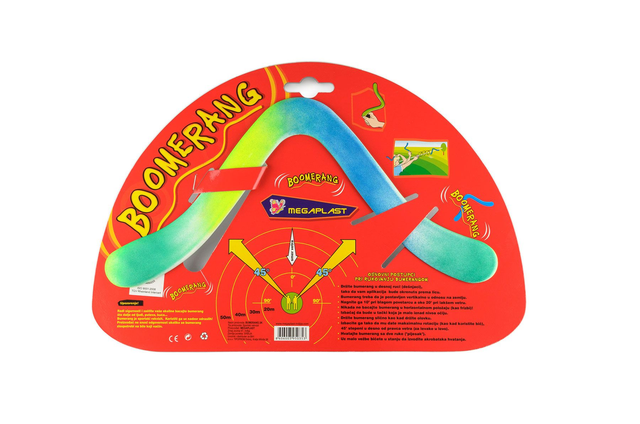Der Bumerang 2K ist ein allseits bekanntes Freizeitsportgerät aus Kunststoff mit einer unregelmäßigen geometrischen Form (zwei Arme). Der Bumerang selbst passt auf ein Quadrat mit einer Grundfläche von 31 x 16 cm und hat eine Höhe von 4 mm.