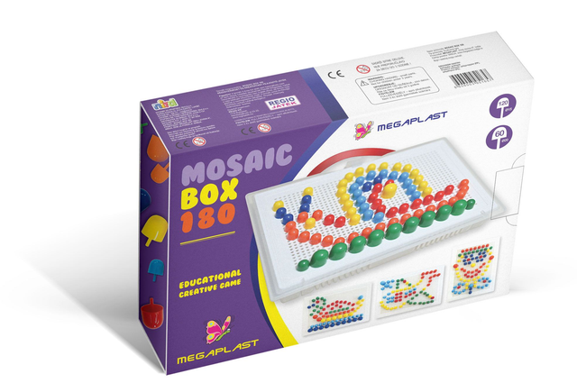 Mosaik Mix - 180 ist ein konstruktives Lernspiel. Das Set besteht aus zwei Kunststoffböden mit Löchern, Kunststoffpins und einer Verpackung. Die Pin-Durchmesser des "Kopfes" sind von 15 mm und 20 mm gemischt. Das Set enthält 180 Pins. Die Mosaik-Pins gibt es in vier verschiedenen Farben.