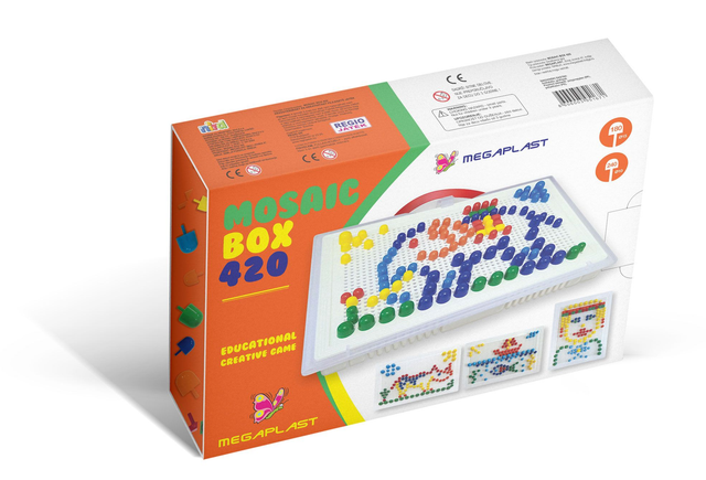 Mosaik Mix - 420 ist ein konstruktives Lernspiel. Das Set besteht aus zwei Kunststoffböden mit Löchern, Kunststoffpins und einer Verpackung. Die Pin-Durchmesser des "Kopfes" sind von 10 mm und 15 mm gemischt. Das Set enthält 420 Pins. Die Mosaik-Pins gibt es in vier verschiedenen Farben.